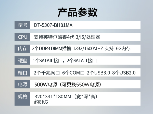 k8·凯发工控DT-5307-BH81MA是一款壁挂式工控机,采用酷睿4代13/15/17处理器,内存2个DDR3,支持16G。300W额定电源。单面出线,支持7个扩展槽,2个千兆网口,6个COM口,支持多种操作系统,欢迎定制。